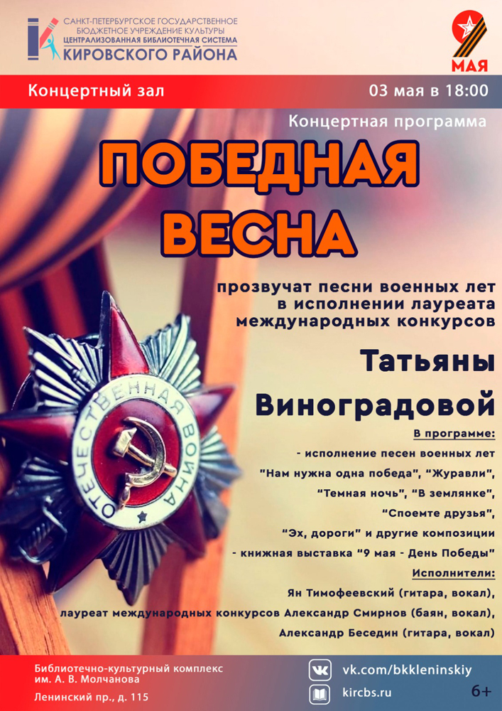 3 Мая в 18.00 в Библиотечно-культурном комплексе им. А. В. Молчанова (Ленинский пр., д. 115) состоится Концерт "Победная весна".