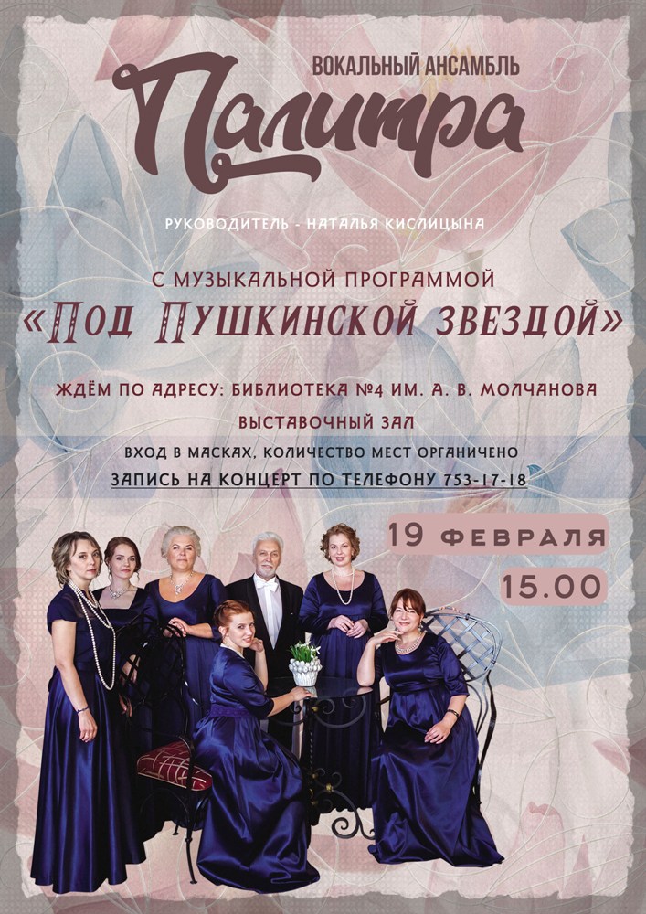 19 февраля в 15.00 в выставочном зале Библиотечно-культурного комплекса им. А. В. Молчанова состоится концерт "Под Пушкинской звездой", посвященный Дню памяти А. С. Пушкина.