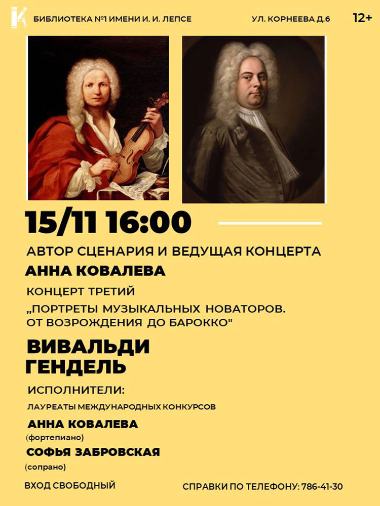 Библиотека №1 имени И. И. Лепсе приглашает на третий концерт цикла "Портреты музыкальных новаторов. От Возрождения до Барокко", посвященный Вивальди и Генделю. Автор сценария и ведущая концерта - Анна Ковалева.