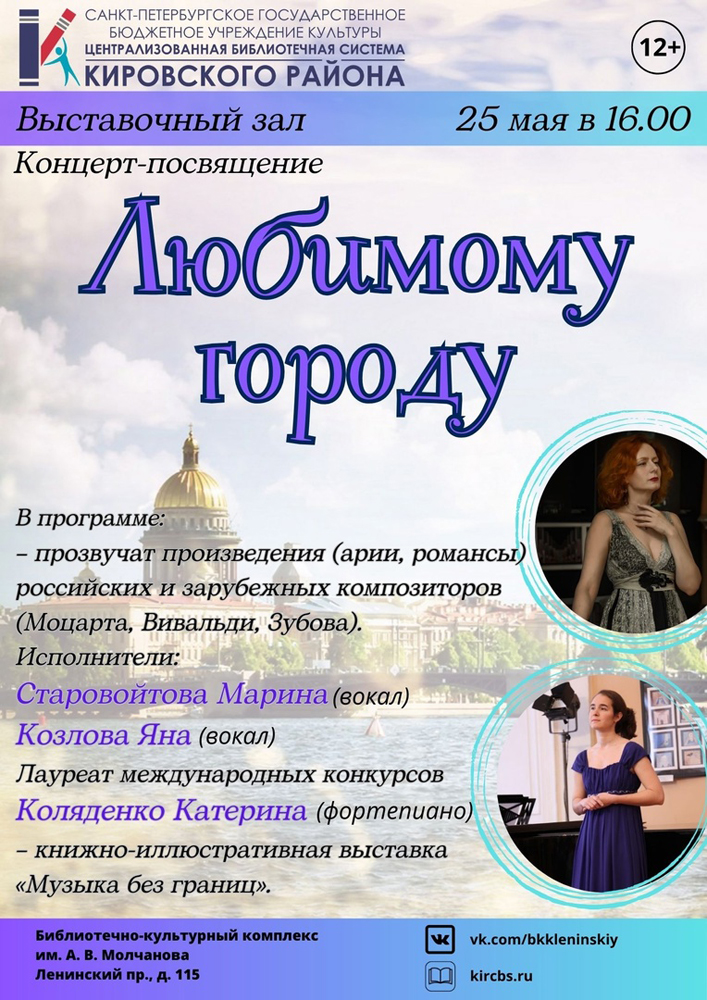 25 мая в 16.00 в Выставочном зале Библиотечно-культурного комплекса им. А. В. Молчанова (Ленинский пр., д. 115) состоится Концерт-посвящение "Любимому городу".