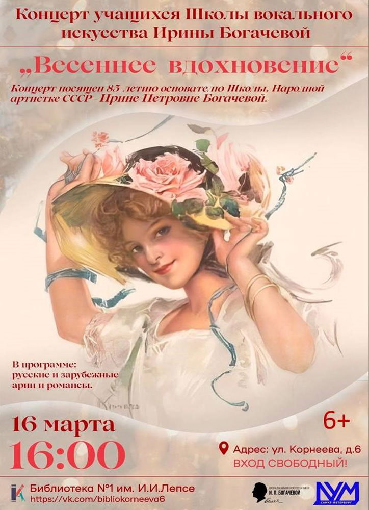 Библиотека №1 им. И. И. Лепсе приглашает на Концерт учащихся Школы вокального искусства Ирины Богачевой "Весеннее вдохновение".