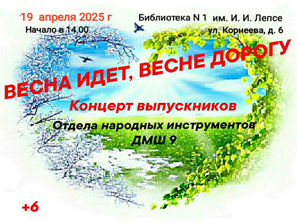 Библиотека №1 им. И. И. Лепсе приглашает на концерт "Весна идет, весне дорогу" выпускников отдела народных инструментов Детской музыкальной школы №9.