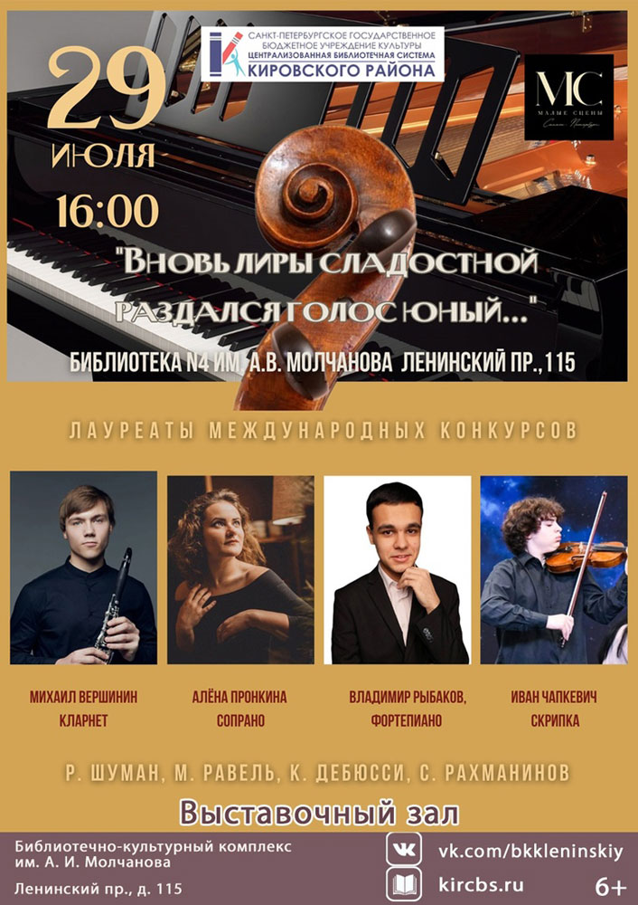 29 июля в 16.00 в Выставочном зале Библиотечно-культурного комплекса им. А. В. Молчанова (Ленинский пр., д. 115) состоится Концерт "Вновь лиры сладостной раздался голос юный".