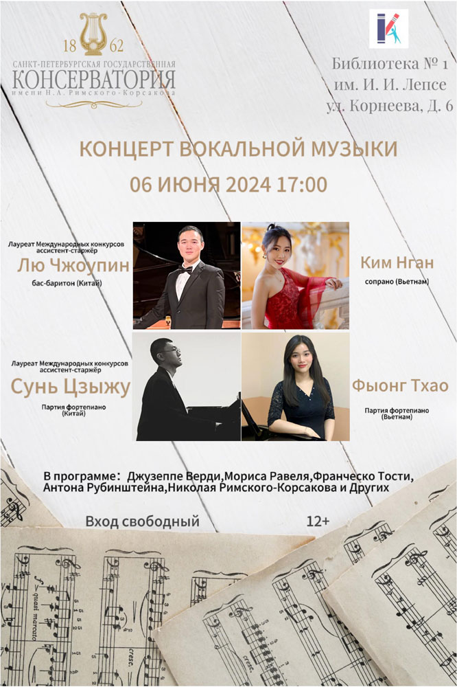 Библиотека №1 им. И. И. Лепсе приглашает на Концерт вокальной музыки. Прозвучат произведения Джузеппе Верди, Мориса Равеля, Франческо Тости, Антона Рубинштейна, Николая Римского-Корсакова и др.