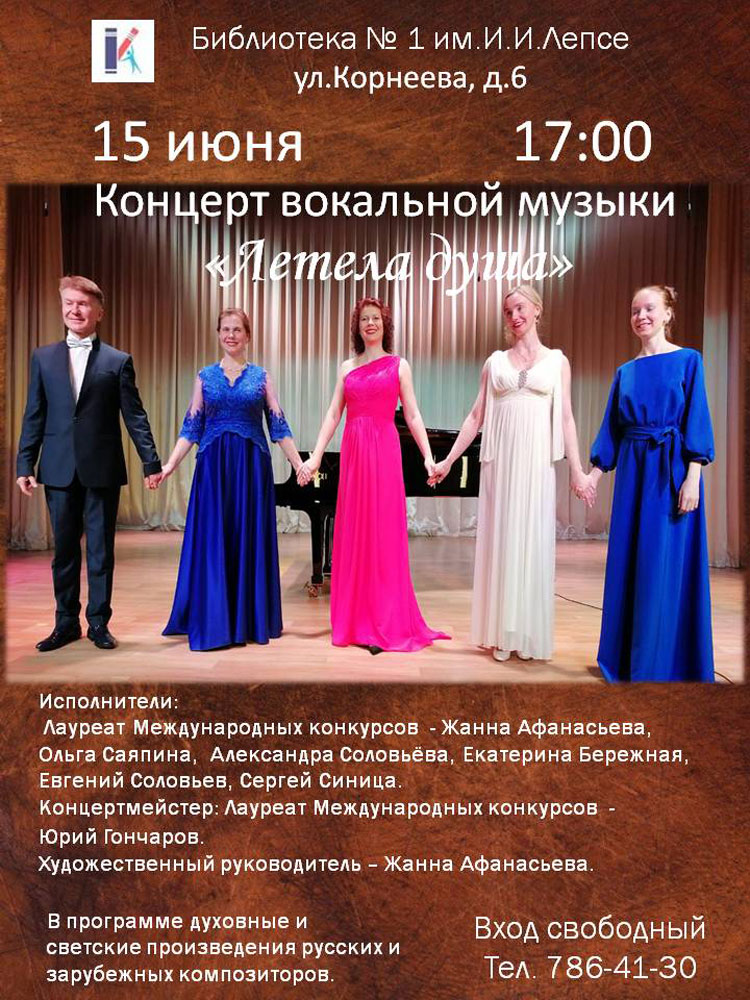 Библиотека №1 им. И. И. Лепсе приглашает на Концерт вокальной музыки "Летела душа".