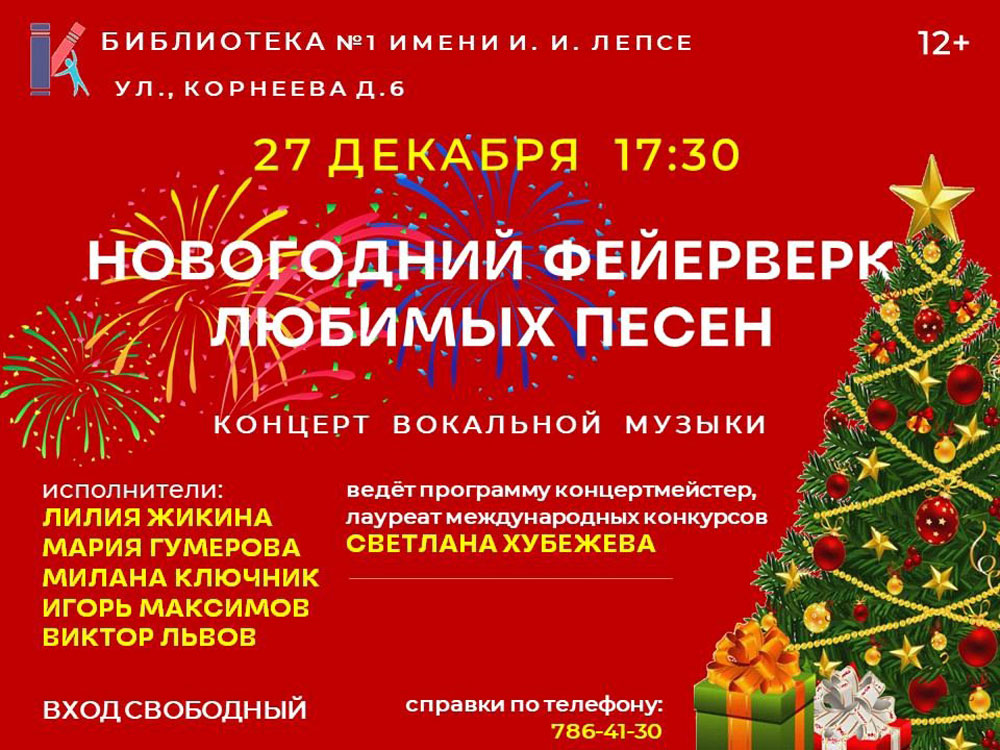 Библиотека №1 им. И. И. Лепсе приглашает на Концерт вокальной музыки "Новогодний фейерверк любимых песен".