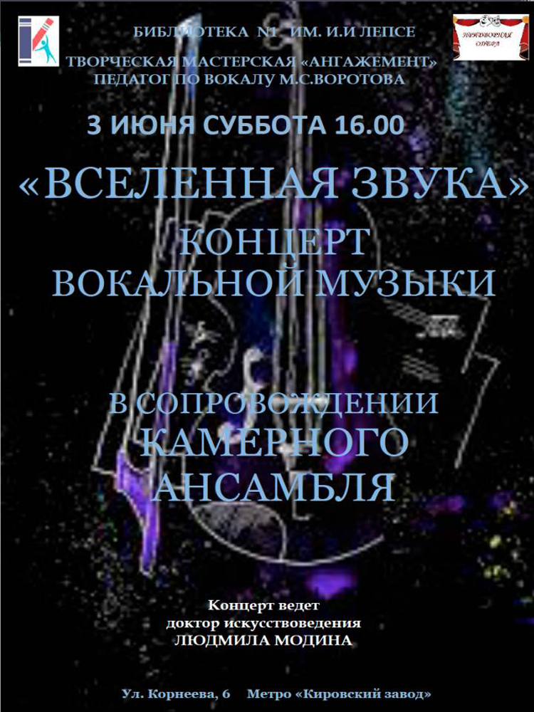 Библиотека №1 им. И. И. Лепсе приглашает на Концерт вокальной музыки "Вселенная звука" в сопровождении камерного ансамбля.