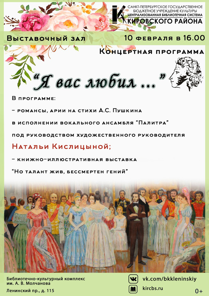10 февраля 16.00 в Библиотечно-культурном комплексе им. А. В. Молчанова (Ленинский пр., д. 115) состоится Концертная программа "Я вас любил…"