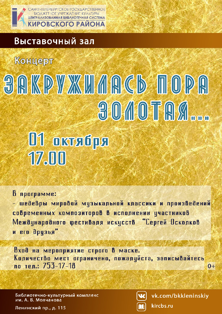 1 октября в 17 часов в выставочном зале Библиотеки №4 (Библиотечно-культурный комплекс) им. А. В. Молчанова состоится Концерт "Закружилась пора золотая…", посвященный Международному дню пожилых людей.