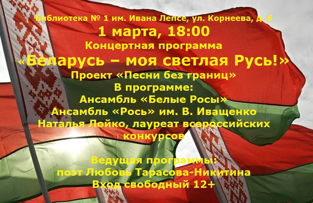 Библиотека №1 им. И. И. Лепсе приглашает на Концертную программу "Беларусь - моя светлая Русь" в рамках проекта Российско-Белорусской дружбы "Песни без границ".