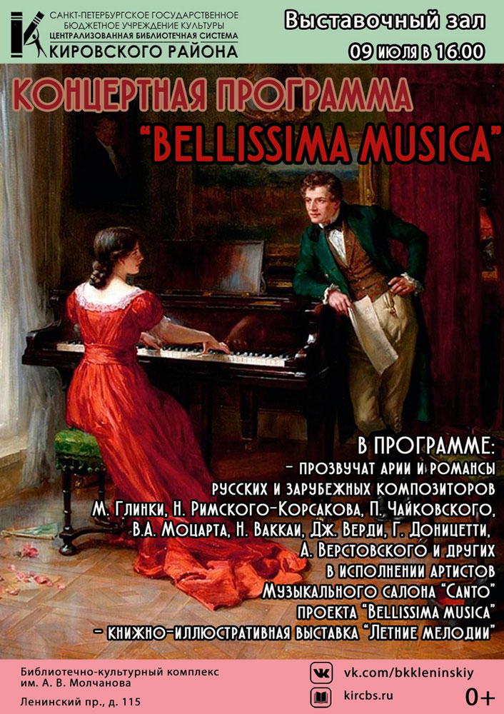 9 июля в 16.00 в Выставочном зале Библиотечно-культурного комплекса им. А. В. Молчанова (Ленинский пр., д. 115) состоится Концертная программа "Bellissima musica".