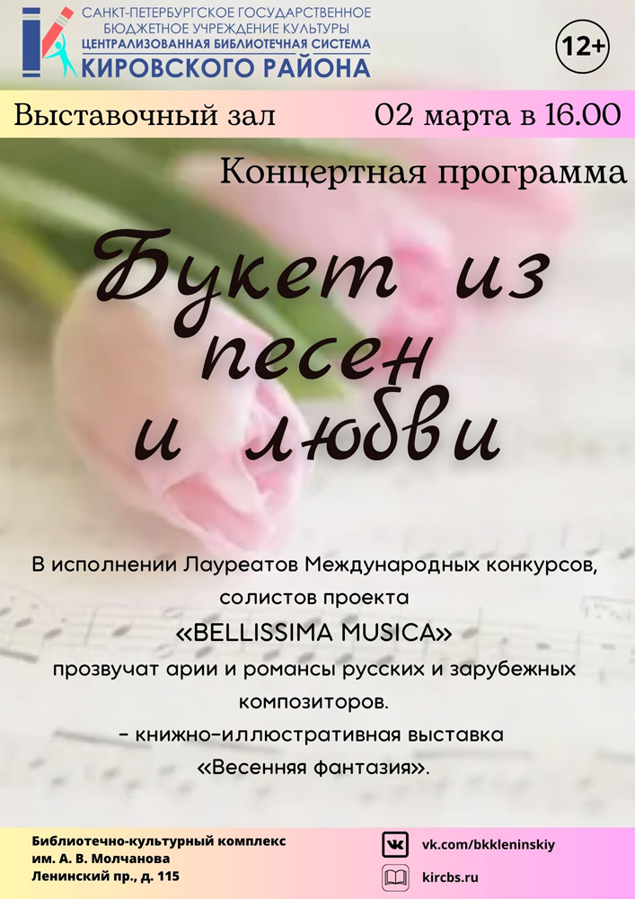2 марта в 16.00 в Выставочном зале Библиотечно-культурного комплекса им. А. В. Молчанова (Ленинский пр., д. 115) состоится Концертная программа "Букет из песен и любви".
