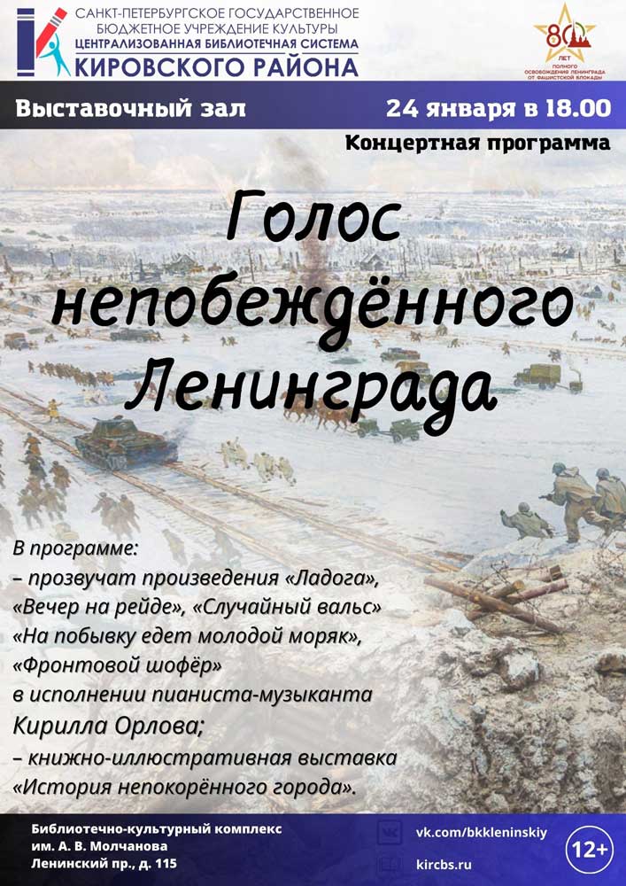 24 января в 18.00 в выставочном зале Библиотечно-культурного комплекса им. А. В. Молчанова состоится Концертная программа "Голос непобеждённого Ленинграда".
