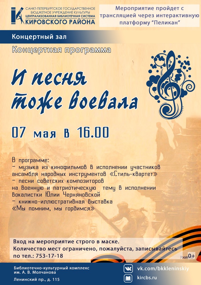7 мая в 16.00 в Библиотечно-культурном комплексе им. А.В. Молчанова состоится Концертная программа "И песня тоже воевала", посвященная Дню Победы советского народа в Великой Отечественной войне 1941-1945 годов.