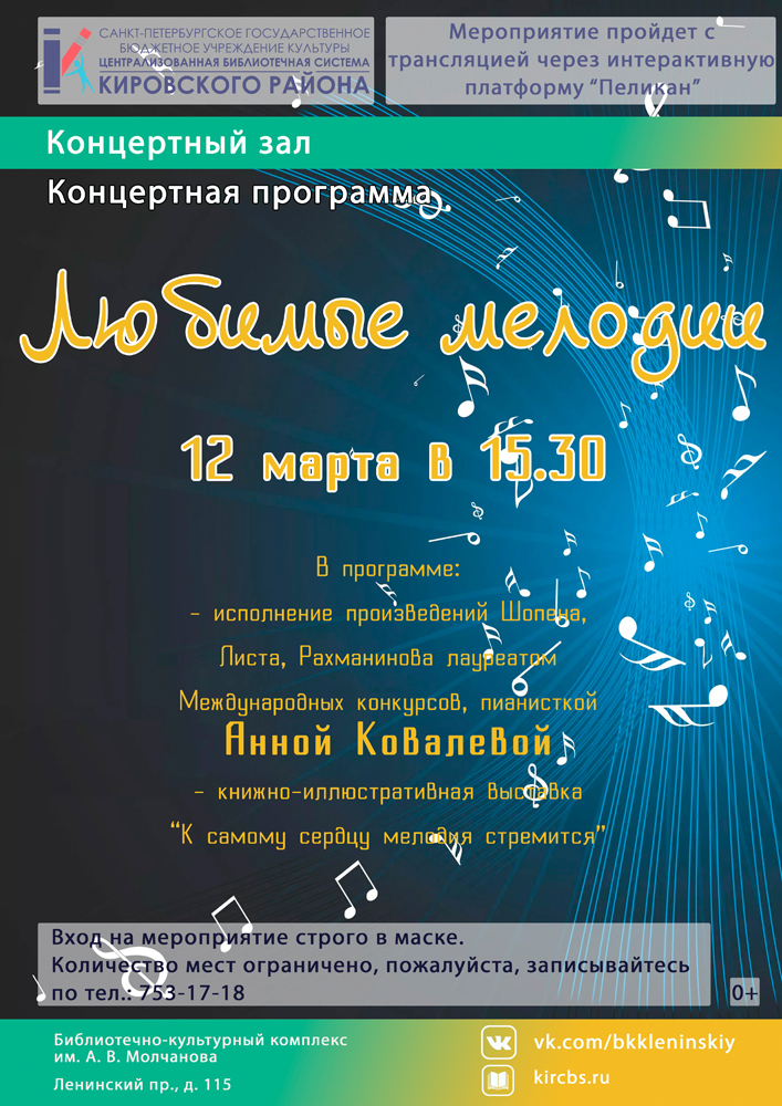 12 марта в 15.30 в концертном зале Библиотечно-культурного комплекса им. А. В. Молчанова состоится Концертная программа "Любимые мелодии".