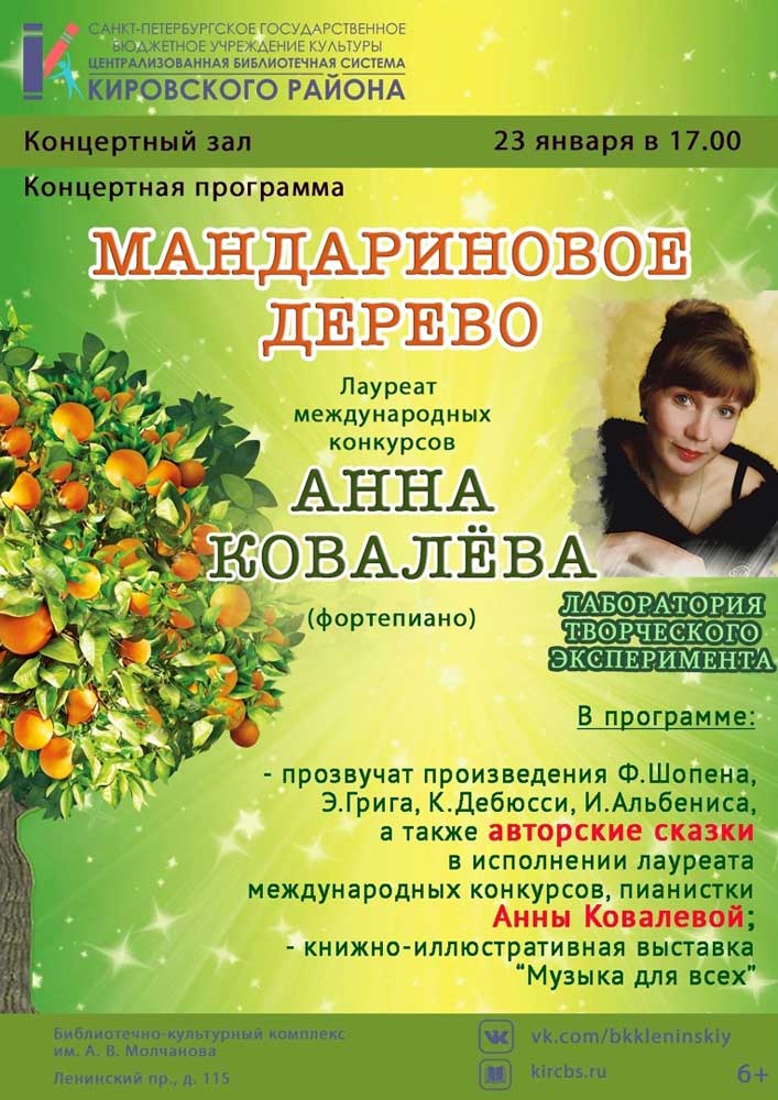 23 января в 17.00 в концертном зале Библиотечно-культурного комплекса им. А. В. Молчанова состоится Концертная программа "Мандариновое дерево".