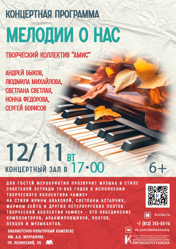 12 ноября в 17.00 в Концертном зале Библиотечно-культурного комплекса им. А. В. Молчанова (Ленинский пр., д. 115) состоится Концертная программа "Мелодии о нас".