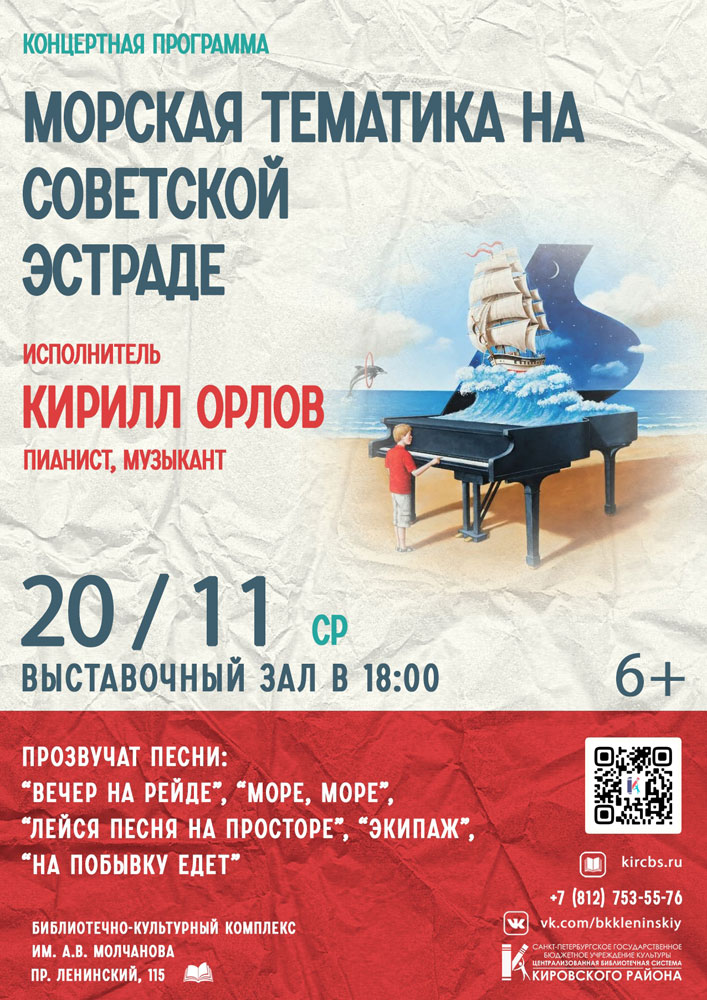 20 ноября в 18.00 в Выставочном зале Библиотечно-культурного комплекса им. А. В. Молчанова (Ленинский пр., д. 115) состоится Концертная программа "Морская тематика на советской эстраде".