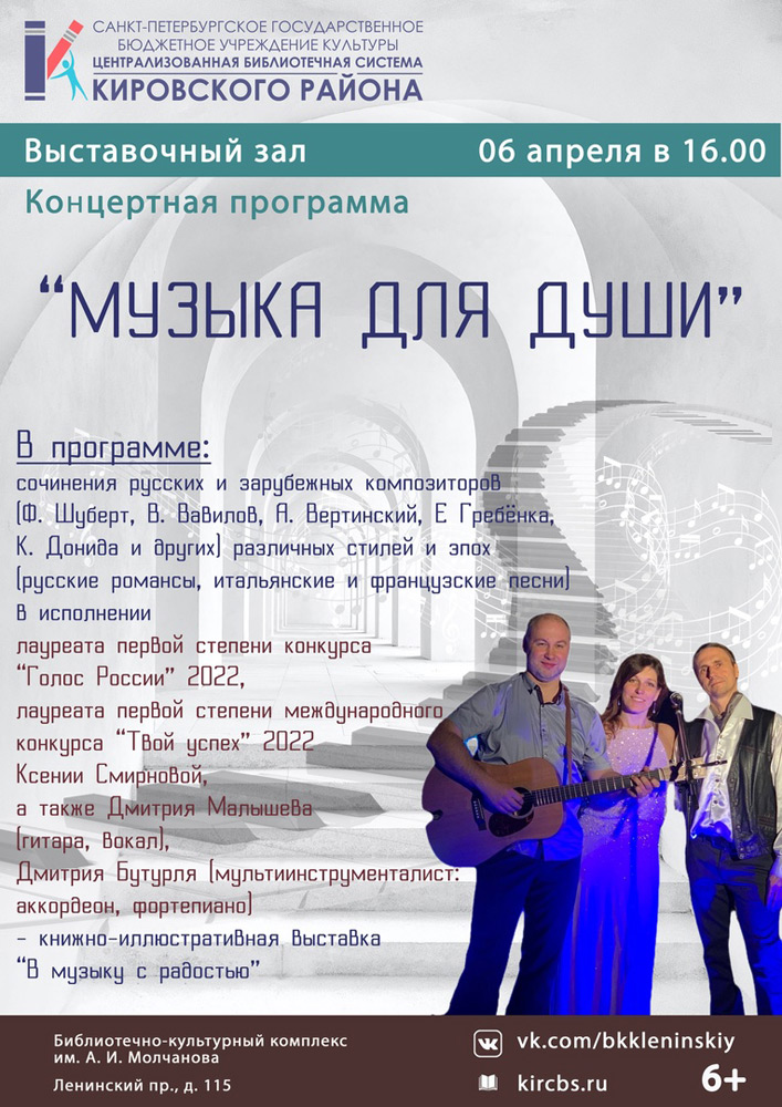 6 апреля в 16.00 в Выставочном зале Библиотечно-культурного комплекса им. А. В. Молчанова (Ленинский пр., д. 115) состоится Концертная программа "Музыка для души".