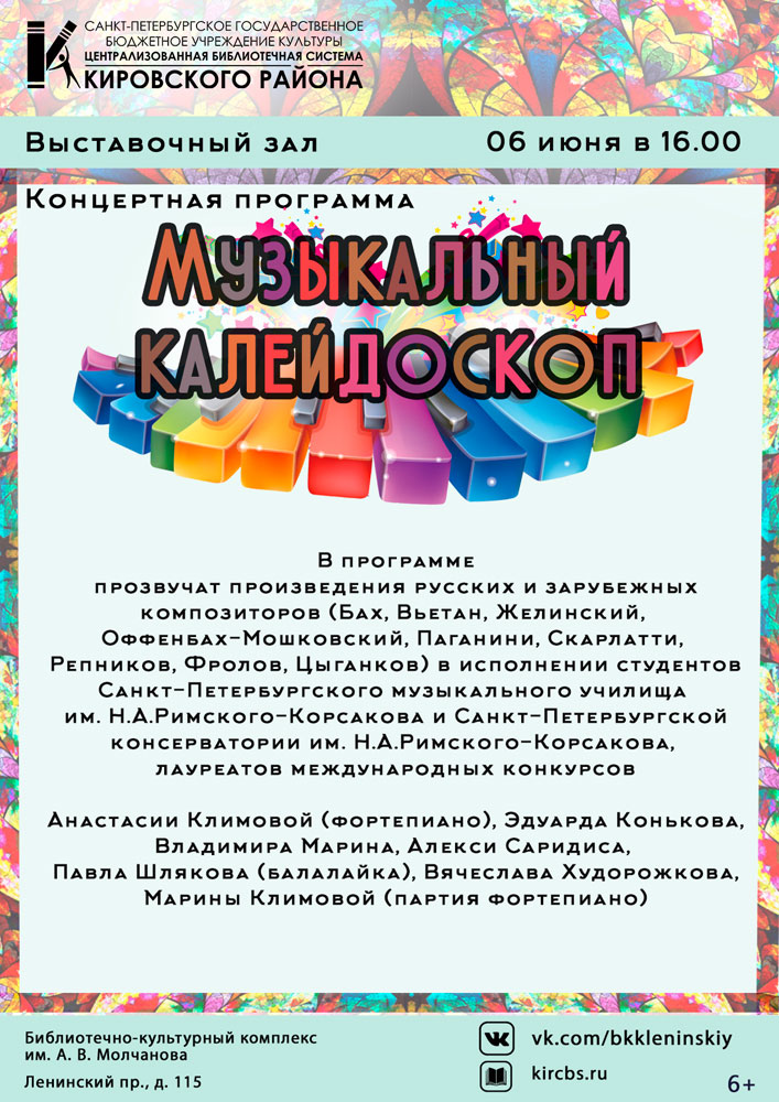 6 июня в 16.00 в Библиотечно-культурном комплексе им. А. В. Молчанова (Ленинский пр., д. 115) состоится Концертная программа "Музыкальный калейдоскоп".