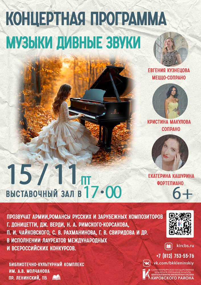 15 ноября в 17.00 в Выставочном зале Библиотечно-культурного комплекса им. А. В. Молчанова (Ленинский пр., д. 115) состоится Концертная программа "Музыки дивные звуки".