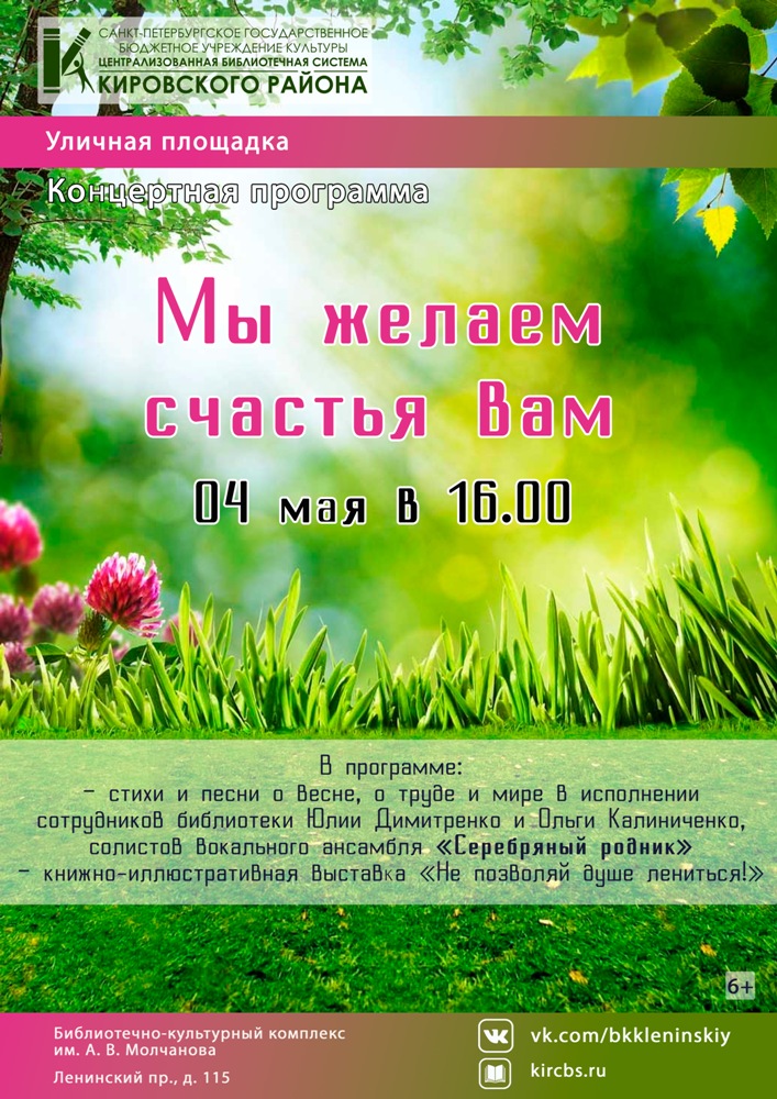 4 мая в 16.00 на площадке перед Библиотечно-культурным комплексом будет проходить Концертная программа "Мы желаем счастья вам".