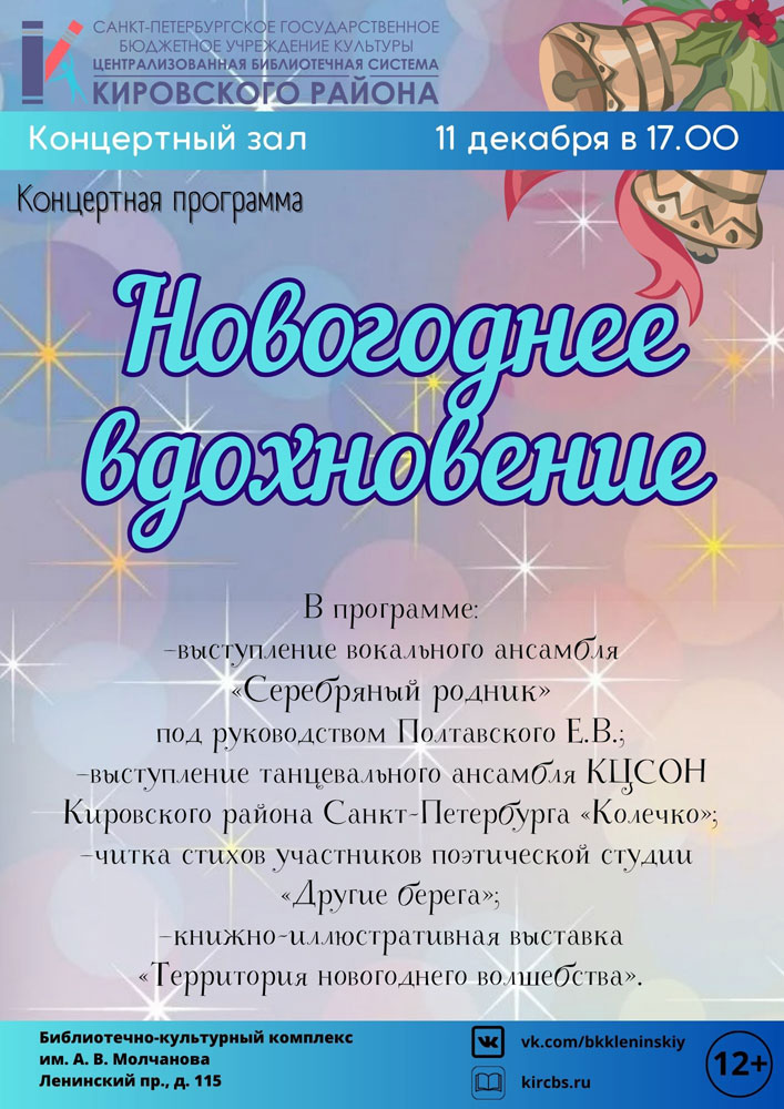 11 декабря в 17.00 в Библиотечно-культурном комплексе им. А. В. Молчанова (Ленинский пр., д. 115) состоится Концертная программа "Новогоднее вдохновение", посвященная Новому году.