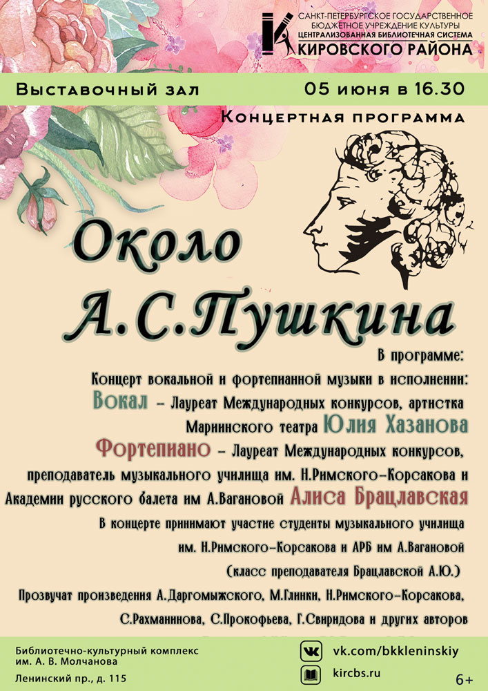 5 июня в 16.30 в Библиотечно-культурном комплексе им. А. В. Молчанова (Ленинский пр., д. 115) состоится Концерт вокальной и фортепианной музыки "Около А. С. Пушкина", приуроченный ко дню рождения великого поэта.