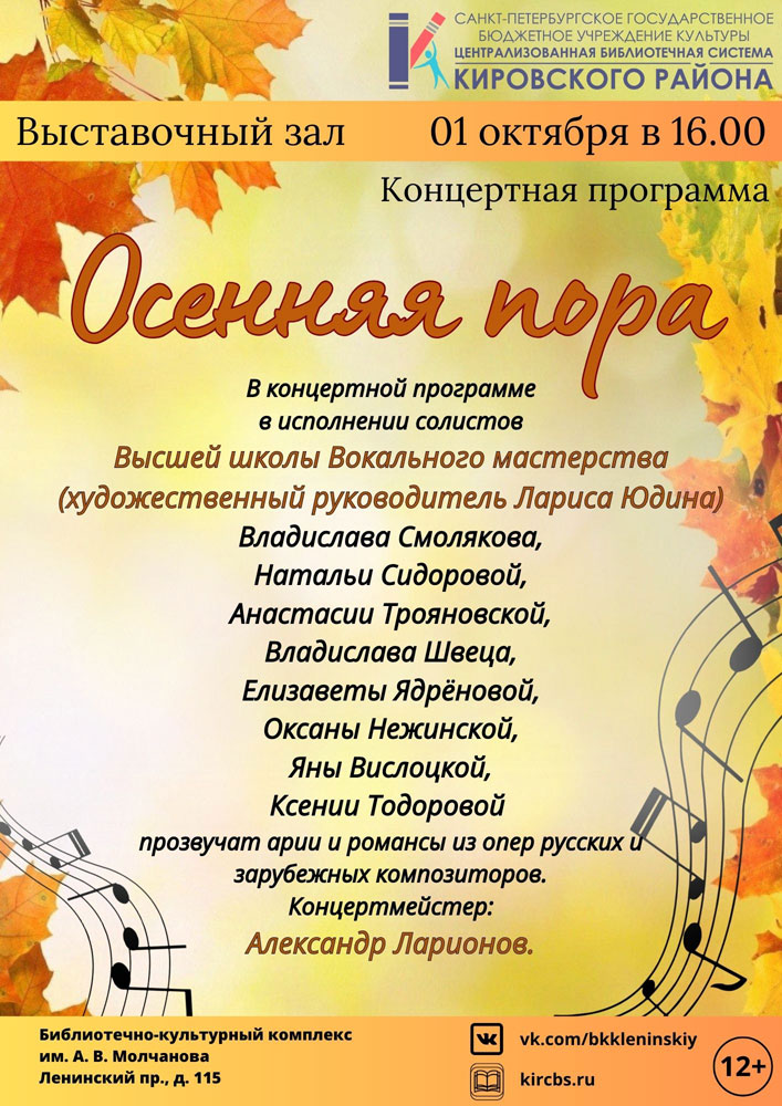 1 октября в 16.00 в Выставочном зале Библиотечно-культурного комплекса им. А. В. Молчанова (Ленинский пр., д. 115) состоится Концертная программа "Осенняя пора".