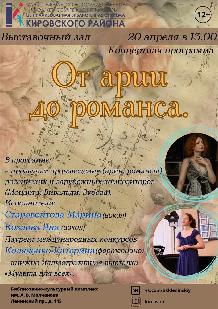 20 апреля в 13.00 в Выставочном зале Библиотечно-культурного комплекса им. А. В. Молчанова (Ленинский пр., д. 115) состоится Концертная программа "От арии до романса".
