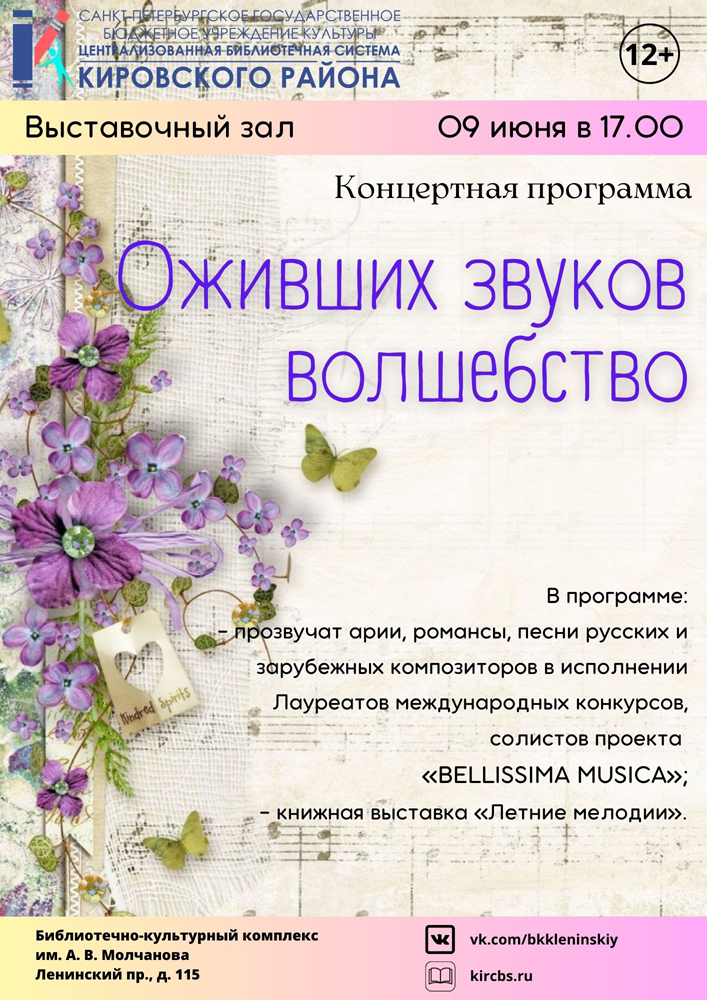 9 июня в 17.00 в выставочном зале Библиотечно-культурного комплекса им. А. В. Молчанова состоится Концертная программа "Оживших звуков волшебство".