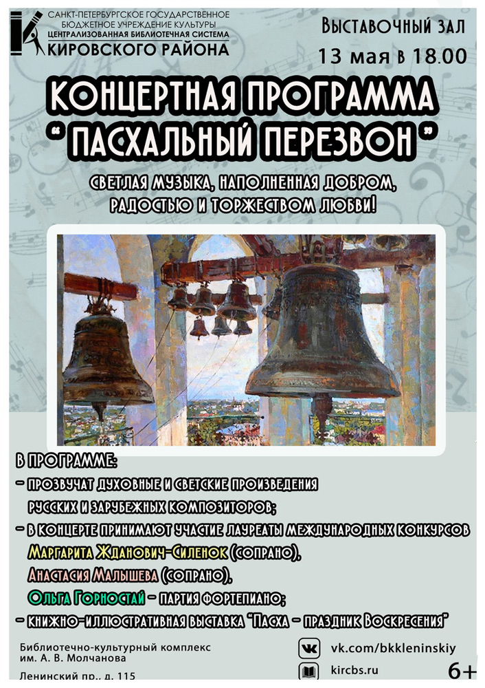 13 мая в 18.00 в Выставочном зале Библиотечно-культурного комплекса им. А. В. Молчанова (Ленинский пр., д. 115) состоится Концертная программа "Пасхальный перезвон".