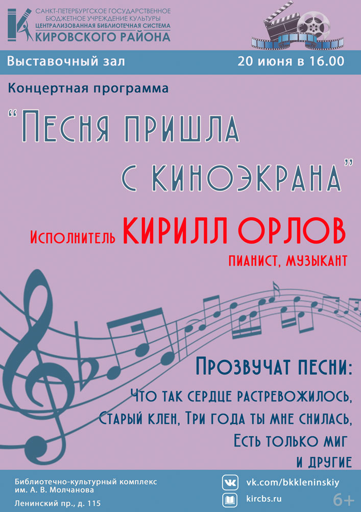 20 июня в 16.00 в Библиотечно-культурном комплексе им. А. В. Молчанова (Ленинский пр., д. 115) состоится Концертная программа "Песня пришла с киноэкрана".