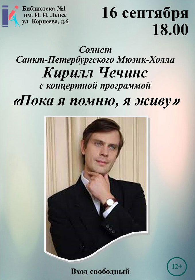 Библиотека №1 им. И. И. Лепсе приглашает всех желающих на Концертную программу "Пока я помню, я живу" в исполнении солиста Санкт-Петербургского Мюзик-Холла Кирилла Чечинса.