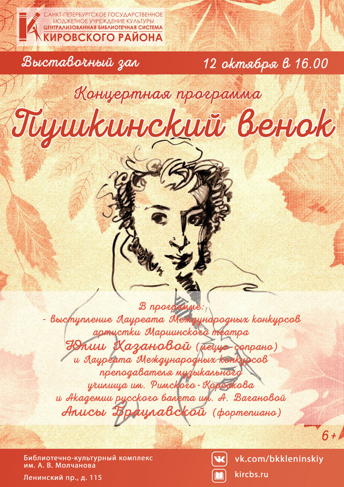 12 октября в 16.00 в Библиотечно-культурном комплексе им. А. В. Молчанова состоится Концертная программа "Пушкинский венок", посвященная Дню Царскосельского лицея.
