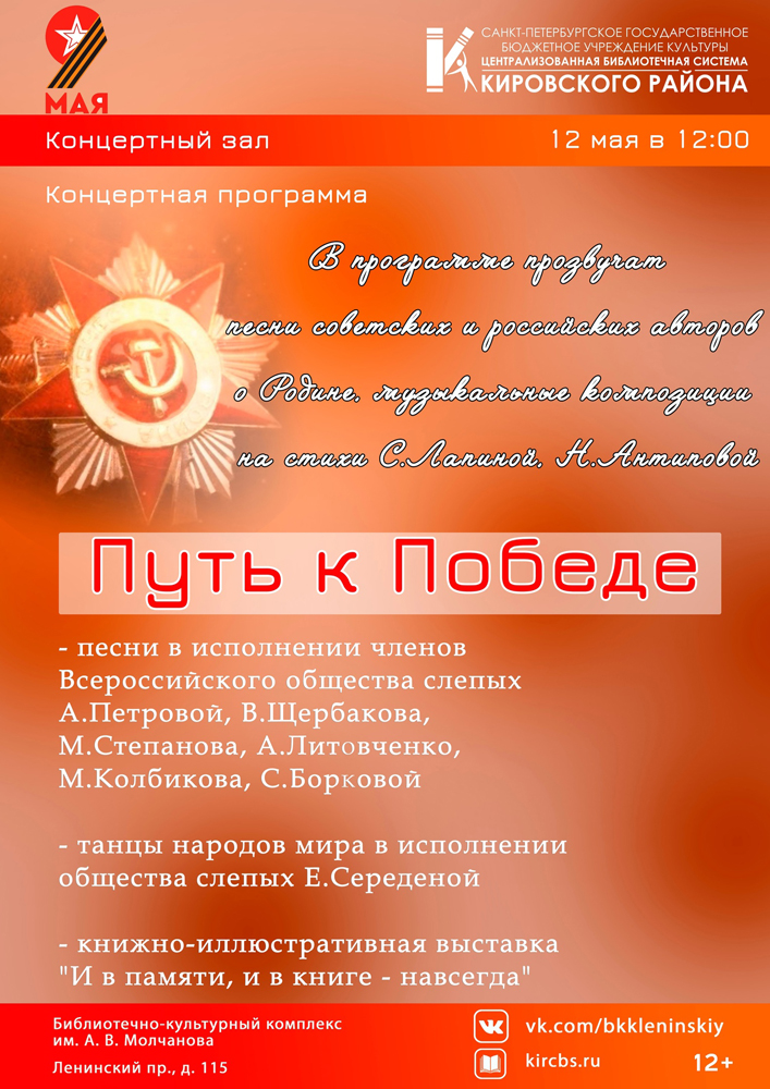 12 Мая в 12.00 в Библиотечно-культурном комплексе им. А. В. Молчанова (Ленинский пр., д. 115) состоится Концертная программа "Путь к Победе".