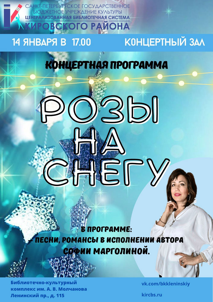 Субботний вечер 14 января начнётся в Библиотечно-культурном комплексе на Ленинском, 115 в 17 часов. Лауреат международных конкурсов, поэтесса, композитор и певица София Марголина представит публике свою праздничную программу "Розы на снегу".