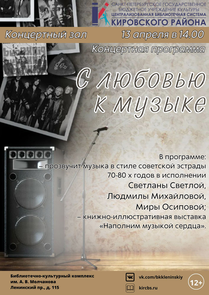 13 апреля в 14.00 в Концерном зале Библиотечно-культурного комплекса им. А. В. Молчанова (Ленинский пр., д. 115) состоится Концертная программа "С любовью к музыке".