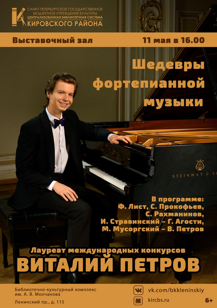 11 мая в 16.00 в Выставочном зале Библиотечно-культурного комплекса им. А. В. Молчанова (Ленинский пр., д. 115) состоится Концертная программа "Шедевры фортепианной музыки".
