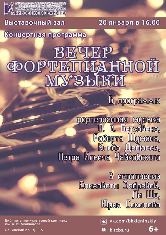 20 января в 16.00 в выставочном зале Библиотечно-культурного комплекса им. А. В. Молчанова состоится Концертная программа "Вечер фортепианной музыки".