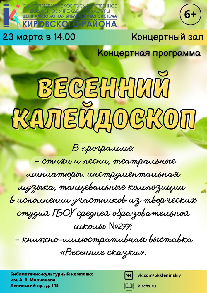 23 марта в 14.00 в концертном зале Библиотечно-культурного комплекса им. А. В. Молчанова состоится Концертная программа "Весенний калейдоскоп".