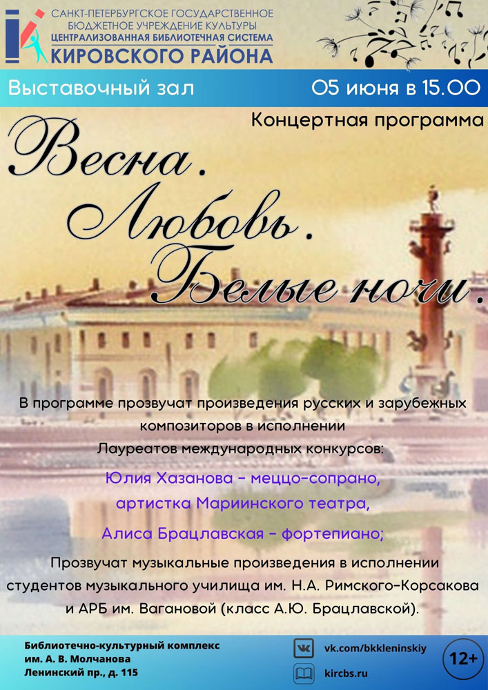 5 июня в 15.00 в Выставочном зале Библиотечно-культурного комплекса им. А. В. Молчанова (Ленинский пр., д. 115) состоится Концертная программа "Весна, Любовь, Белые ночи".