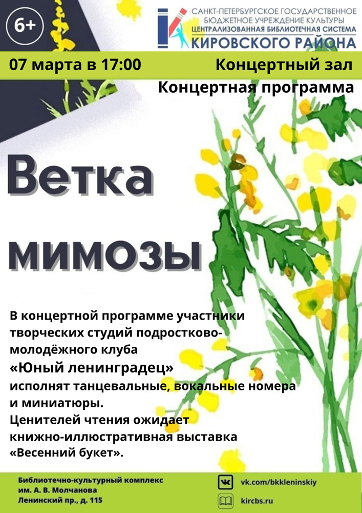 7 марта в 17.00 в Концертном зале Библиотечно-культурного комплекса им. А. В. Молчанова (Ленинский пр., д. 115) состоится Концертная программа "Ветка мимозы".
