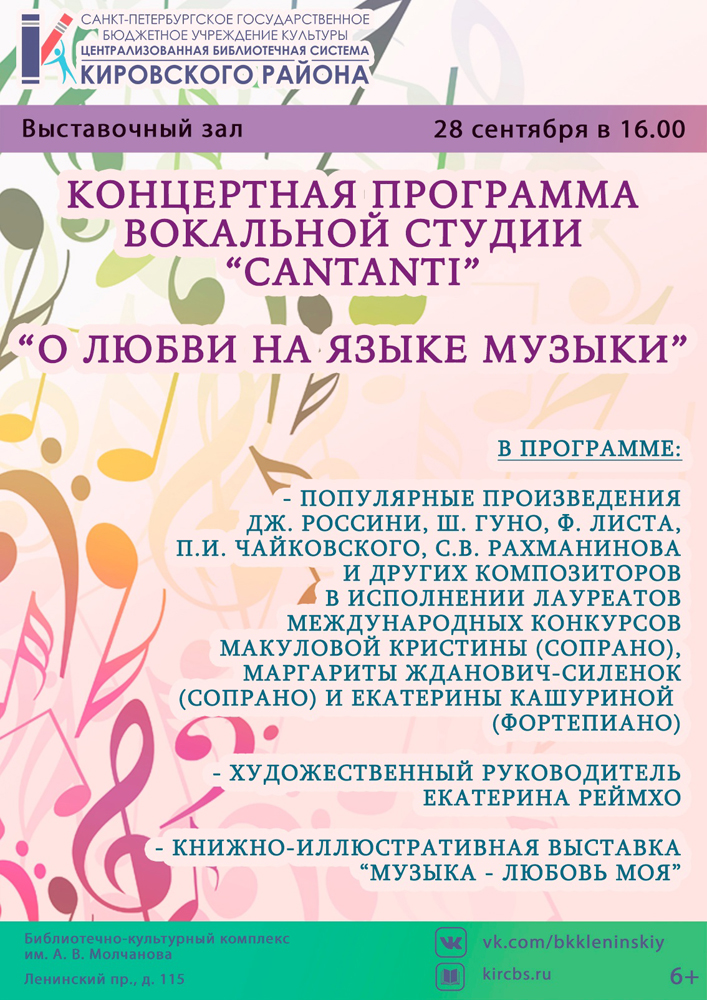 28 сентября в 16.00 в Выставочном зале Библиотечно-культурного комплекса им. А. В. Молчанова (Ленинский пр., д. 115) состоится Концертная программа вокальной студии "Cantanti" "О любви на языке музыки".