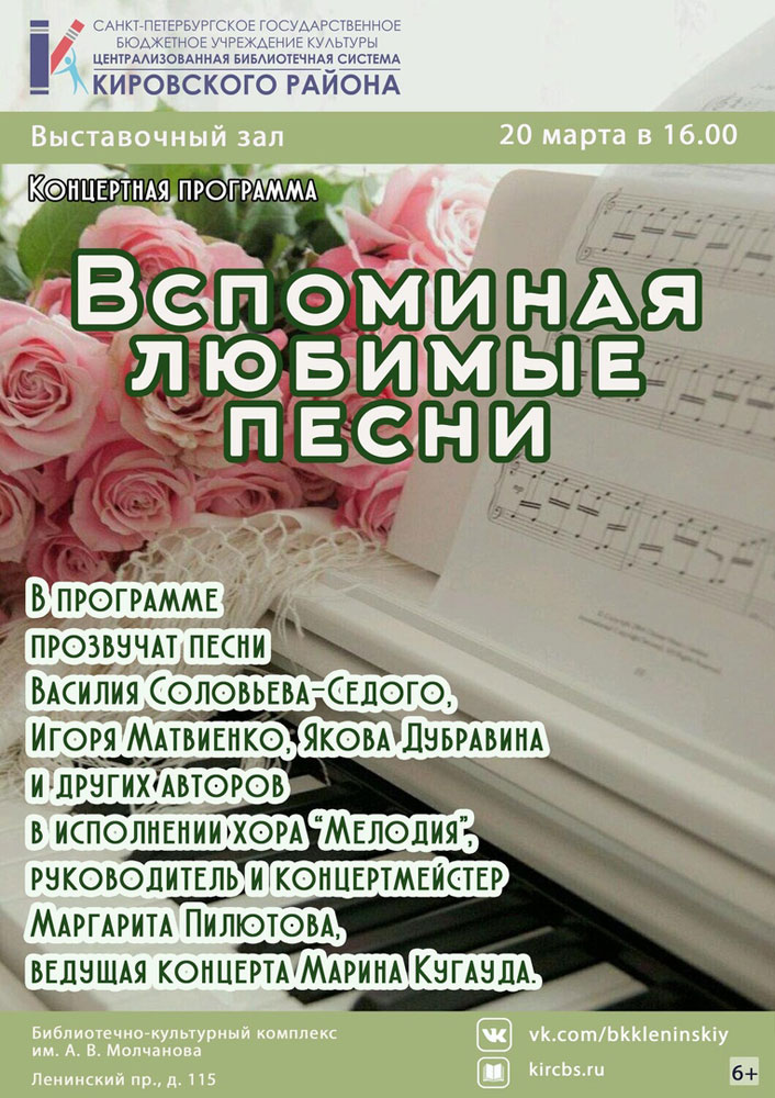 20 марта в 16.00 в Выставочном зале Библиотечно-культурного комплекса им. А. В. Молчанова (Ленинский пр., д. 115) состоится Концертная программа "Вспоминая любимые песни".