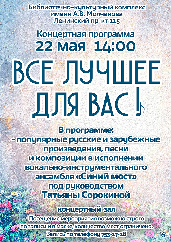 22 мая в 14.00 в концертном зале Библиотеки №4 (Библиотечно-культурный комплекс) имени А. В. Молчанова, в рамках мероприятий посвященных Дню славянской письменности и культуры, состоится Концертная программа "Всё лучшее для вас!".