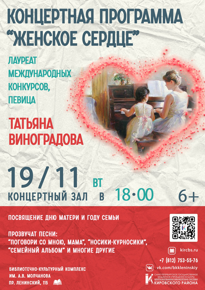 19 ноября в 18.00 в Коцертном зале Библиотечно-культурного комплекса им. А. В. Молчанова (Ленинский пр., д. 115) состоится Концертная программа "Женское сердце".