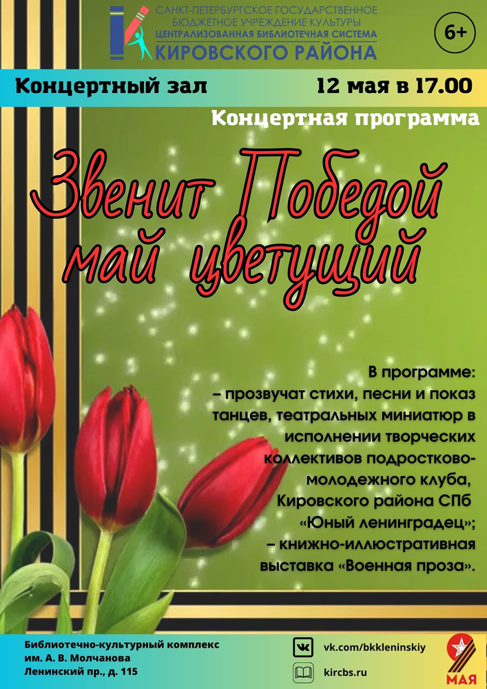 12 мая в 17.00 в концертном зале Библиотечно-культурного комплекса им. А. В. Молчанова состоится Концертная программа "Звенит Победой май цветущий".