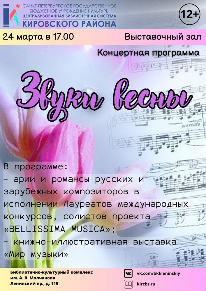 24 марта в 17.00 в выставочном зале Библиотечно-культурного комплекса им. А. В. Молчанова состоится Концертная программа "Звуки весны".