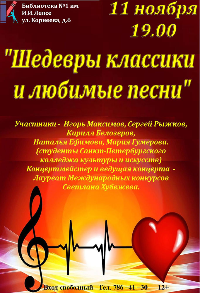 11 ноября в 19.00 Библиотека №1 им. И. И. Лепсе приглашает всех желающих Концертную программу "Шедевры классики и любимые песни".